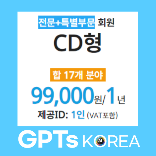■ 사용가능한 전문+특별 부문 GPTs 서비스 분야(17개) <전문 부문> - 컨설팅 - 마케팅 - 고객지원 - 영업판매 - 세무회계 - 인적자원 - 경영지원 <특별 부문> - 평가분석 - 법무노무특허 - 생산물류유통 - 임원(간부) - 대표(사장) - 소상공인 - 공무원 - 종교 - 교사(교수) ■ 추가 기능 지원 - Free의 모든 해당 기능 - GPTs 개발 신청(1개)